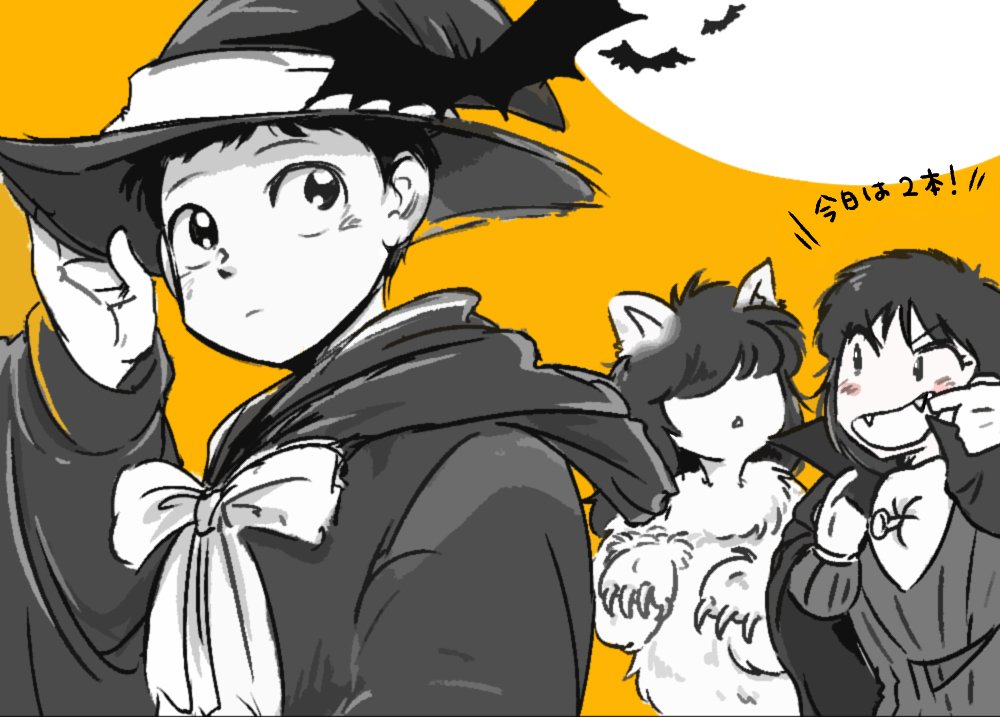 スマホのゲームで悪魔的なデザインのタケシカード(ハロウィンデザイン)が大量に手に入るイベントがあってめっちゃ楽しかったですという絵 新田はドンドラキュラのコスプレ