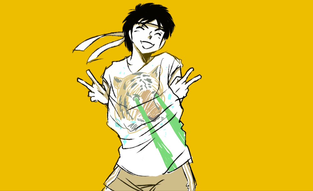 目からビームを出してる虎のカットソーを着てガカモレのモデルさんのポーズを真似してる笑顔ダブルピースのマツヤマ